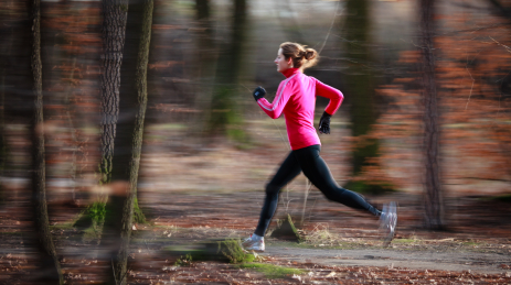 Young woman running outdoors in a city park on a cold fall/winter day (motion blurred image)